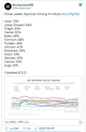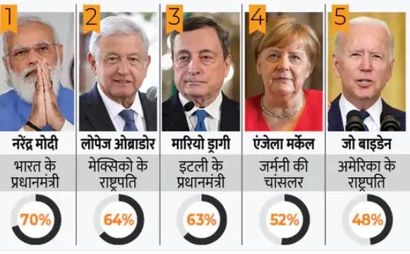 मॉर्निंग कंसल्ट के इस सर्वे में पीएम मोदी की अप्रूवल रेटिंग सबसे अधिक 70% है। सर्वे में दूसरे नंबर पर मेक्सिको के राष्ट्रपति लोपेज ओबराडोर (64%) और तीसरे नंबर पर इटली के पीएम द्रागी (63%) है। जर्मनी की चांसलर एंगेला मर्केल (52%) चौथे व सुपरपावर अमेरिका के राष्ट्रपति जो बाइडेन (48%) पांचवे स्थान पर हैं।