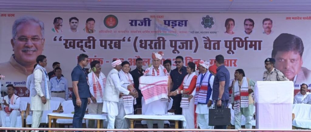 मुख्यमंत्री भूपेश बघेल जशपुर जिले के राजी पाड़ा दीपू बागड़ी मुख्यालय में आयोजित सरहुल पूजा (खद्दी परब) कार्यक्रम में शामिल हुए. उन्होंने विधिपूर्वक पृथ्वी की पूजा की और राज्य के लोगों के लिए सुख, समृद्धि और समृद्धि की कामना की। खादी पर्व धरती पूजन के अवसर पर मुख्यमंत्री श्री बघेल का समाज के नेताओं ने पारंपरिक गीता और पगड़ी पहनाकर स्वागत किया. इस दौरान पारंपरिक वाद्य यंत्र मंदार का भी परिचय दिया गया।