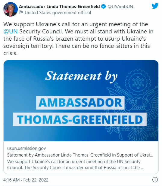 अमेरिका ने यूक्रेन पर संयुक्त राष्ट्र सुरक्षा परिषद की तत्काल बैठक का समर्थन किया – संयुक्त राज्य अमेरिका ने कहा कि वह संयुक्त राष्ट्र सुरक्षा परिषद की तत्काल बैठक के लिए यूक्रेन के आह्वान का समर्थन करता है, रूस द्वारा दो यूक्रेनी अलग क्षेत्रों की मान्यता को “यूक्रेन की संप्रभुता और क्षेत्रीय अखंडता का अकारण उल्लंघन” कहा जाता है। संयुक्त राष्ट्र में अमेरिकी राजदूत लिंडा थॉमस-ग्रीनफील्ड ने एक बयान में कहा, “सुरक्षा परिषद को मांग करनी चाहिए कि रूस संयुक्त राष्ट्र के सदस्य देश यूक्रेन की संप्रभुता और क्षेत्रीय अखंडता का सम्मान करे।”