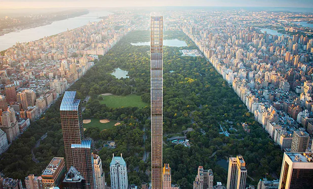 नवनिर्मित, 1,428 फुट ऊंची 111 वेस्ट 57वीं स्ट्रीट, जिसे स्टाइनवे टॉवर के नाम से भी जाना जाता है, दुनिया की सबसे पतली गगनचुंबी इमारत है।
