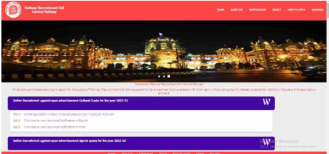 - Central Railway Recruitment 2022 मे ऑनलाइन आवेदन करने के लिए आपको सबसे पहले इसके ऑफिसियल वेबसाइट के होम -पेज पर जाना होगा ।
