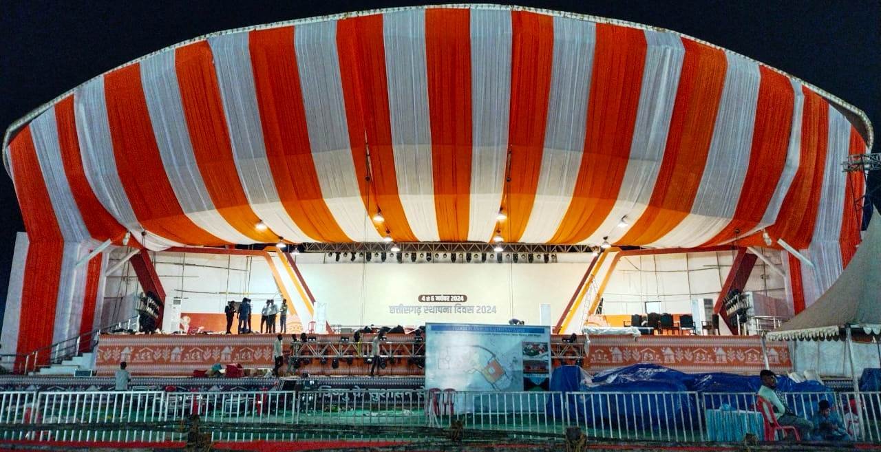रायपुर, 03 नवंबर 2024 : छत्तीसगढ़ राज्य स्थापना दिवस राज्योत्सव 2024 के आयोजन को लेकर तैयारियां जोर-शोर से जारी है। तीन दिवसीय राज्योत्सव का भव्य आयोजन 4 नवम्बर से 6 नवम्बर तक राज्योत्सव स्थल, नया रायपुर अटल नगर में होगा। राज्योत्सव स्थल में मुख्य मंच से लेकर पूरे परिसर की साज-सज्जा का काम तेजी से कराया जा रहा है। शासकीय योजनाओं एवं उपलब्धियों के प्रचार-प्रसार के लिए सभी विभागों के अधिकारी अपने-अपने विभाग का प्रदर्शनी स्टॉल लगाए जाने की तैयारी में जुटे हैं।