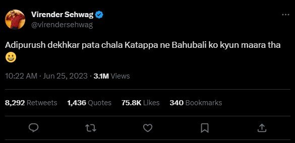 आदिपुरुष’ देखने के बाद मुझे पता चला कि कटप्पा ने ‘बाहुबली’ को क्यों मारा I सहवाग ने किया Tweet….