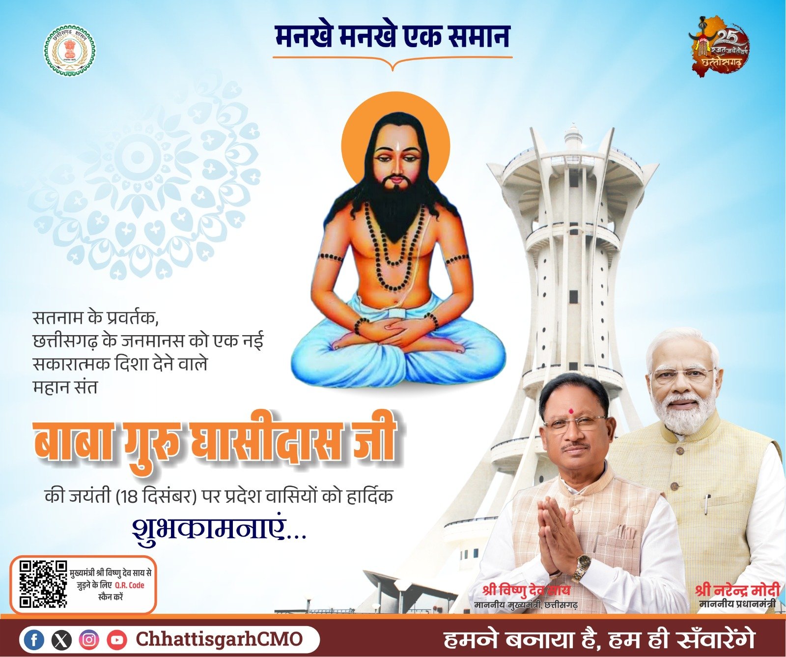 रायपुर 17 दिसम्बर 2024 : मुख्यमंत्री श्री विष्णु देव साय ने सतनाम पंथ के प्रवर्तक बाबा गुरू घासीदास जी की 18 दिसम्बर को जयंती पर प्रदेशवासियों को बधाई और शुभकामनाएं दी हैं। श्री साय ने कहा है कि बाबा गुरू घासीदास जी ने अपने उपदेशों के माध्यम से दुनिया को सत्य, अहिंसा और सामाजिक सद्भावना का मार्ग दिखाया। उन्होंने सम्पूर्ण मानव जाति को ’मनखे-मनखे एक समान’ का प्रेरक संदेश देकर समानता और मानवता का पाठ पढ़ाया। बाबा जी ने छत्तीसगढ़ में सामाजिक और आध्यात्मिक जागरण की आधारशिला रखी। उन्होंने लोगों को मानवीय गुणों के विकास का रास्ता दिखाया और नैतिक मूल्यों की पुनर्स्थापना की। श्री साय ने कहा कि गुरू घासीदास जी का जीवन दर्शन और विचार मूल्य आज भी प्रासंगिक और समस्त मानव जाति के लिए अनुकरणीय हैं।
