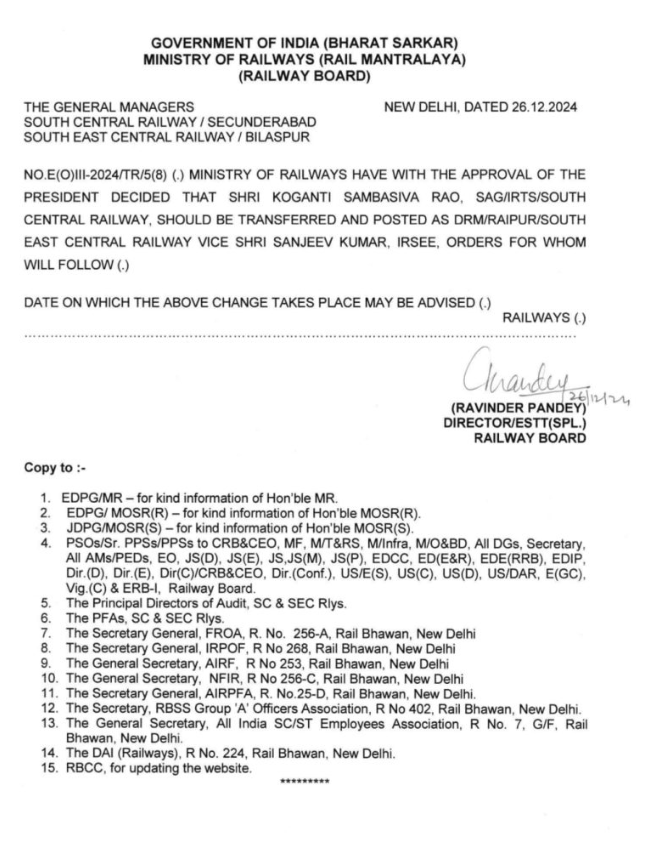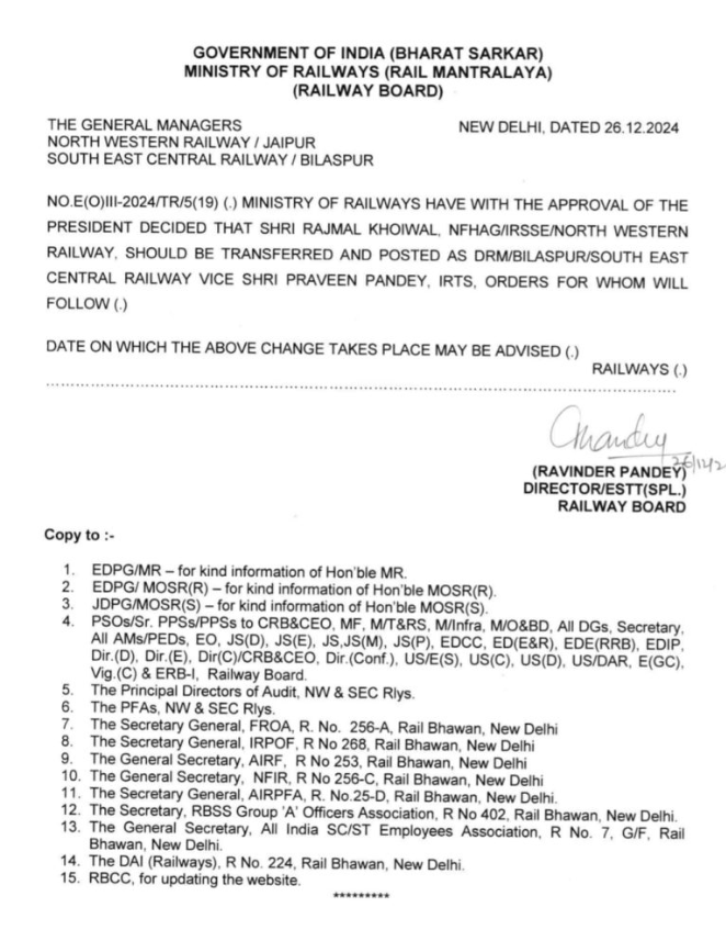 रेलवे में बड़ा बदलाव: रायपुर-बिलासपुर समेत 23 मंडलों के डीआरएम बदले!