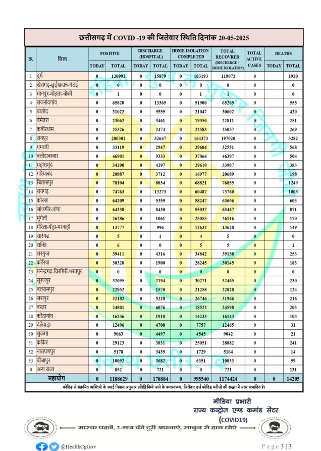 छत्तीसगढ़ में राहत की साँस-फ़िलहाल छत्तीसगढ़ में राहत की बात है। स्वास्थ्य विभाग की रिपोर्ट के अनुसार, राज्य में कोरोना का एक भी नया मामला सामने नहीं आया है। कोई एक्टिव केस भी नहीं है। यह एक अच्छी खबर है, लेकिन हमें सावधानी बरतनी होगी।