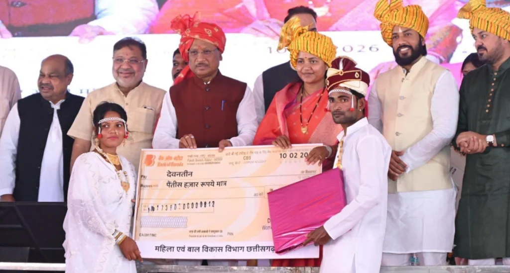 इस ऐतिहासिक आयोजन को गोल्डन बुक ऑफ वर्ल्ड रिकॉर्ड में दर्ज किया जाना छत्तीसगढ़ के लिए गर्व और गौरव का विषय है। इस समारोह की विशेषता यह भी रही कि इसमें हिंदू, मुस्लिम, ईसाई, बौद्ध तथा विशेष पिछड़ी जनजाति बैगा समुदाय के जोड़ों ने अपने-अपने धार्मिक रीति-रिवाजों के अनुसार विवाह संपन्न किए। यह आयोजन छत्तीसगढ़ की सांस्कृतिक विविधता, आपसी सद्भाव और सर्वधर्म समभाव की भावना का जीवंत प्रतीक बन गया। मुख्यमंत्री विष्णु देव साय ने इस अवसर पर कहा कि मुख्यमंत्री कन्या विवाह योजना गरीब और जरूरतमंद परिवारों के लिए सम्मान, विश्वास और सामाजिक सुरक्षा का मजबूत आधार बन गई है। उन्होंने कहा कि एक समय ऐसा था जब आर्थिक रूप से कमजोर परिवारों के लिए बेटियों का विवाह बड़ी चिंता का विषय होता था, लेकिन इस योजना ने उस चिंता को दूर कर हजारों परिवारों के जीवन में नई खुशियां और विश्वास का संचार किया है। योजना के अंतर्गत प्रत्येक नवविवाहित दंपति को 35 हजार रुपये की आर्थिक सहायता प्रदान की गई।