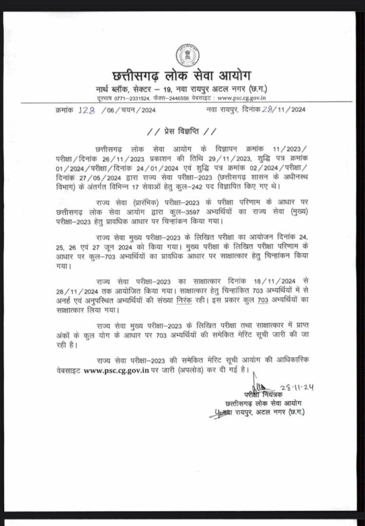 रायपुर, 28 नवम्बर 2024: मुख्यमंत्री श्री विष्णु देव साय ने छत्तीसगढ राज्य लोक सेवा आयोग द्वारा आयोजित राज्य सेवा परीक्षा-2023 में हुए सफल अभ्यर्थियों को बधाई और शुभकामनाएं दी हैं। उन्होंने कहा कि युवाओं के कंधे पर छत्तीसगढ़ के विकास की महती जिम्मेदारी है। मुख्यमंत्री श्री साय ने उम्मीद जताई कि राज्य सेवा परीक्षा में चयनित युवा शासकीय सेवा में आकर पूरी ईमानदारी से जनता की सेवा करेंगे। उन्होंने चयनित युवाओं को पूरी तन्मयता से कार्य करते हुए छत्तीसगढ़ के विकास में अपना बहुमूल्य योगदान देने की अपील की है।