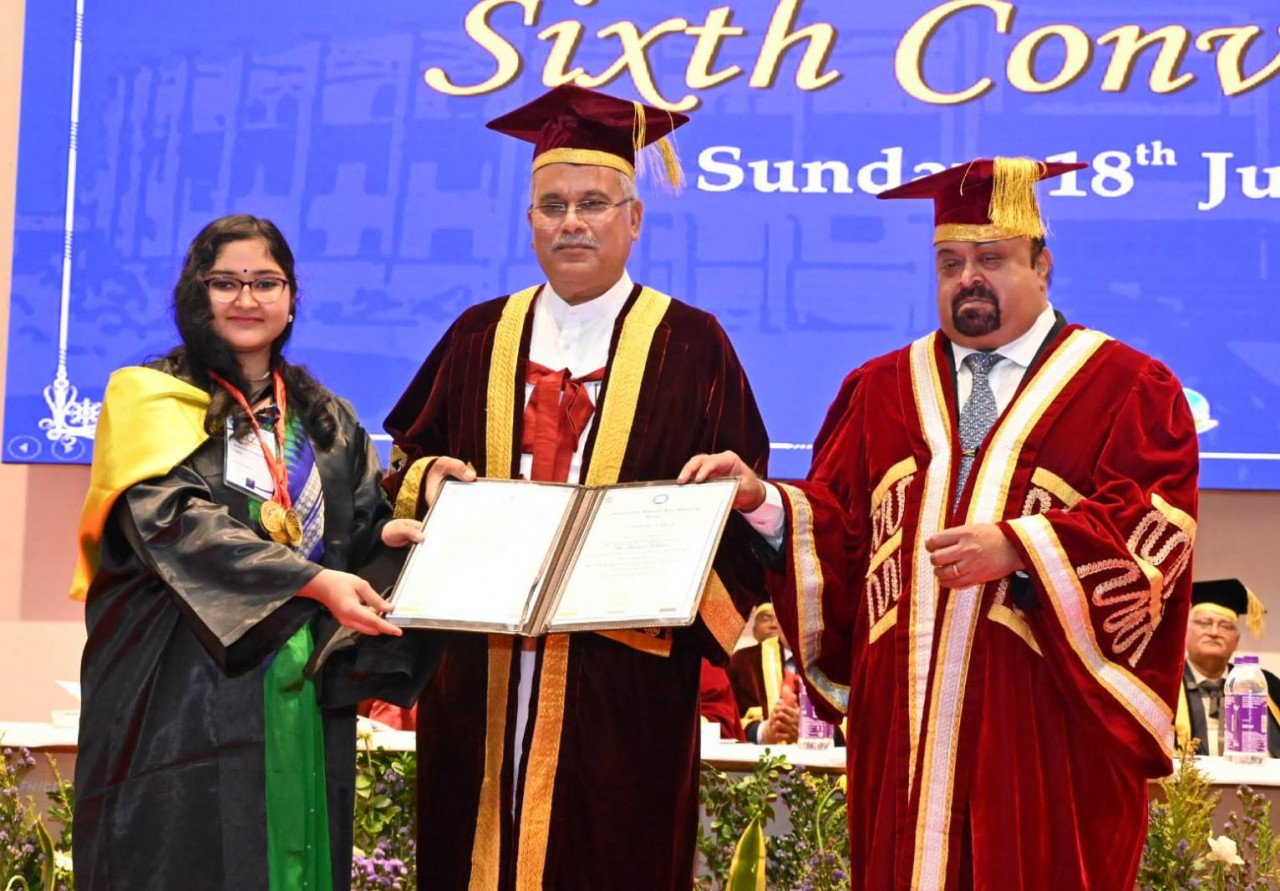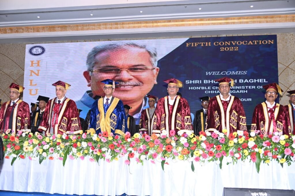 मुख्यमंत्री श्री भूपेश बघेल आज हिदायतुल्लाह राष्ट्रीय विधि विश्वविद्यालय, नवा रायपुर के छठे दीक्षांत समारोह में शामिल हुए। ट्रिपल आईटी ऑडिटोरियम में आयोजित दीक्षांत समारोह की अध्यक्षता माननीय श्री जस्टिस अनिरुद्ध बोस, भारत के सर्वोच्च न्यायालय के न्यायाधीश और एचएनएलयू के विजिटर ने की। इस अवसर पर एचएनएलयू के कुलाधिपति एवं छत्तीसगढ़ उच्च न्यायालय के मुख्य न्यायाधीश श्री रमेश सिन्हा ने दीक्षांत समारोह प्रारंभ होने की घोषणा की। कार्यक्रम के एक हिस्से के रूप में राइट नेचर एंड सस्टेनेबिलिटी नामक पुस्तक और एचएनएलयू जर्नल ऑफ लॉ एंड सोशल साइंसेज प्रकाशित की गई।