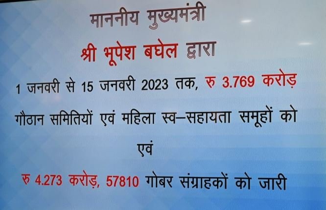 -मुख्यमंत्री ने 1 जनवरी से 15 जनवरी तक गौठानों में पशुपालक ग्रामीणों, किसानों, भूमिहीनों से क्रय 2.13 लाख क्विंटल गोबर के एवज में उनके खाते में 4 करोड़ 27 लाख रूपए की राशि ऑन लाईन अंतरित की