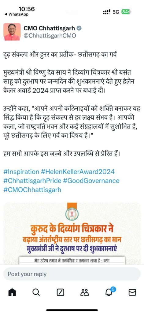 आत्मविश्वास से परिपूर्ण और अनेक बच्चों और युवाओं के लिए प्रेरणास्त्रोत का कार्य कर रहे धमतरी जिले के कुरूद में रहने वाले दिव्यांग समाजसेवी और चित्रकार श्री बसंत साहू को मुख्यमंत्री श्री विष्णुदेव साय ने फोन करके जन्मदिन की बधाई देने के साथ ही हेलन केलर अवार्ड 2024 से सम्मानित होने पर बधाई दी है। मुख्यमंत्री श्री विष्णुदेव साय ने श्री बसंत साहू को जन्मदिन और सम्मान के लिए बधाई देते हुए कहा कि आपको हेलेन केलर अवार्ड 2024 प्राप्त होने की सूचना समाचार के माध्यम से मिली। आपकी इस उपलब्धि के लिए बहुत-बहुत बधाई।