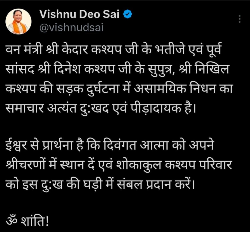 रायपुर, 23 जुलाई 2025: मुख्यमंत्री  विष्णु देव साय ने आज राजधानी रायपुर स्थित विधायक कॉलोनी में आयोजित शोक सभा में शामिल होकर वन मंत्री  केदार कश्यप के भतीजे एवं बस्तर के पूर्व सांसद दिनेश कश्यप के सुपुत्र स्वर्गीय निखिल कश्यप को श्रद्धांजलि अर्पित की। मुख्यमंत्री ने स्व. निखिल कश्यप की पार्थिव देह पर पुष्पांजलि अर्पित कर उन्हें अंतिम विदाई दी तथा शोकाकुल परिजनों से भेंट कर गहरी संवेदना प्रकट की। मुख्यमंत्री  साय ने इस दुःखद अवसर पर ईश्वर से दिवंगत आत्मा की शांति एवं परिजनों को इस अपार दुःख को सहन करने की शक्ति प्रदान करने की प्रार्थना की। इस अवसर पर छत्तीसगढ़ विधानसभा अध्यक्ष डॉ. रमन सिंह, कृषि मंत्री  रामविचार नेताम, महिला एवं बाल विकास मंत्री  लक्ष्मी राजवाड़े सहित अनेक जनप्रतिनिधि, वरिष्ठ प्रशासनिक अधिकारी एवं बड़ी संख्या में आम नागरिक उपस्थित थे।