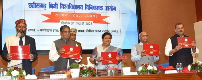 राज्यपाल एवं कुलाधिपति श्रीमती अनुसुइया उइके ने आज रायपुर के नवीन विश्राम भवन में आयोजित छत्तीसगढ़ निजी विश्वविद्यालय नियामक आयोग के 18वें स्थापना दिवस समारोह में शिरकत की. राज्यपाल ने इस अवसर पर आयोग की भूमिका का उल्लेख करते हुए कहा कि राज्य में शिक्षा की स्थिति में सुधार के लिए आयोग को विशेष प्रयास करने होंगे। उन्होंने कहा कि आयोग को न केवल निजी विश्वविद्यालयों में शिक्षा की गुणवत्ता में सुधार के लिए बल्कि छात्रों के व्यक्तित्व के विकास के लिए भी विशेष रूप से काम करना चाहिए। समारोह के एक भाग के रूप में, राज्यपाल ने आयोग को एक स्मारिका ‘ज्ञानामृत’ जारी किया और आयोग के हेल्पलाइन नंबर का भी शुभारंभ किया गया। इसके अलावा राज्यपाल टी.बी. प्रधान मंत्री टी.बी. रोग के उन्मूलन के लिए खड़ा है। उन्होंने स्वतंत्र भारत अभियान का देशव्यापी प्रचार-प्रसार कर जन-जागरूकता का भी आह्वान किया।