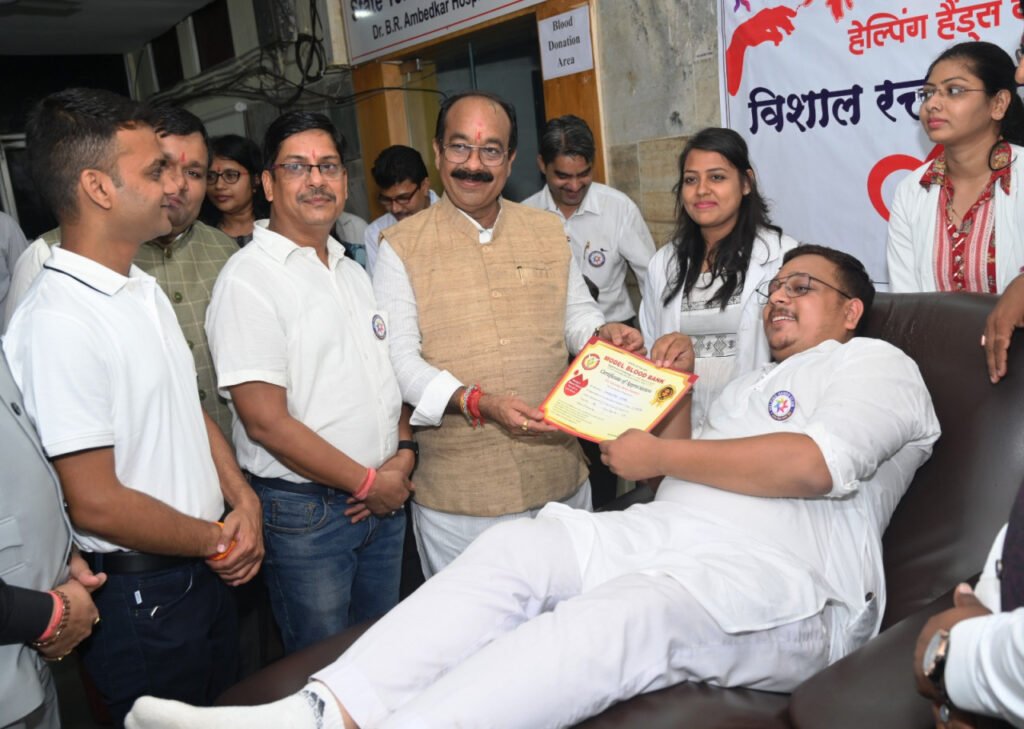 उप मुख्यमंत्री श्री अरुण साव ने आज रायपुर के डॉ. भीमराव अम्बेडकर स्मृति चिकित्सालय में मेगा ब्लड डोनेशन कैंप का शुभारंभ किया। हेल्पिंग हैंड्स क्लब फाउंडेशन द्वारा इसका आयोजन किया गया है। श्री साव ने मेगा ब्लड डोनेशन कैंप के आयोजन के लिए फाउंडेशन को बधाई और साधुवाद दिया। वे इस दौरान रक्तदान कर रहे लोगों से मिले और उनकी हौसला अफजाई की। उन्होंने रक्तदाताओं को प्रमाण पत्र भी वितरित किए।