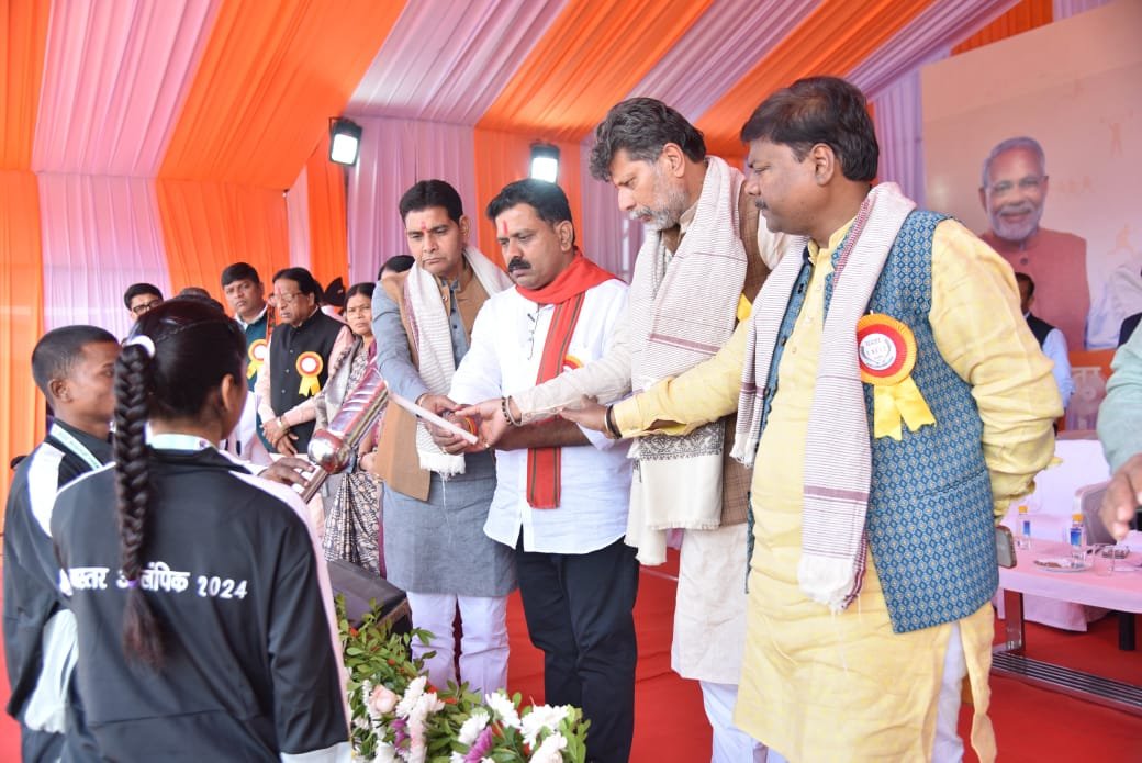 रायपुर, 14 दिसम्बर 2024: बस्तर ओलम्पिक 2024 के तहत संभाग स्तरीय प्रतियोगिता का शनिवार को स्थानीय इंदिरा प्रियदर्शिनी स्टेडियम में विधिवत शुभारंभ करते हुए उप मुख्यमंत्री श्री विजय शर्मा ने समूचे बस्तर संभाग के खिलाड़ियों का उत्साहवर्धन किया। इस दौरान बस्तर संभाग के सभी सातों जिलों के खिलाड़ियों ने आकर्षक मार्च पास्ट प्रस्तुत कर दर्शकों को मंत्रमुग्ध कर दिया। इस अवसर पर उप मुख्यमंत्री श्री विजय शर्मा ने प्रतियोगिता शुभारंभ समारोह को सम्बोधित करते हुए कहा कि बस्तर के युवाओं ने इतनी बड़ी संख्या में स्पर्धा में भाग लेकर इस महत्ती आयोजन का प्रतिभागी बने। सरकार बस्तर के युवाओं को समाज की मुख्यधारा में शामिल कर विकास में सहभागी बनाने के लिए कटिबद्ध होकर कार्य कर रही है। यही वजह है कि बस्तर के युवा लोकतंत्र के विकास के मार्ग में आगे आकर भूमिका निभा रहे हैं। बस्तर ओलम्पिक खेल प्रतियोगिता के विजेता विकास के मॉडल होगें। बस्तर की गांव-गांव में विकास की धारा पहुंचे, इस दिशा में सरकार हर संभव प्रयास कर रही है, जिससे आने वाले दिनों में बस्तर में चहुंओर शांति और विकास की बयार बहेगी।