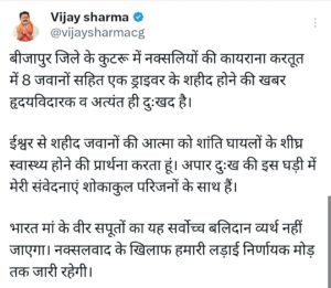 उपमुख्यमंत्री विजय शर्मा ने बीजापुर जिले के कुटरू में नक्सलियों द्वारा किए गए आईईडी ब्लास्ट में 8 जवानों सहित एक वाहन चालक के शहीद होने की दुःखद घटना पर किया शोक व्यक्त