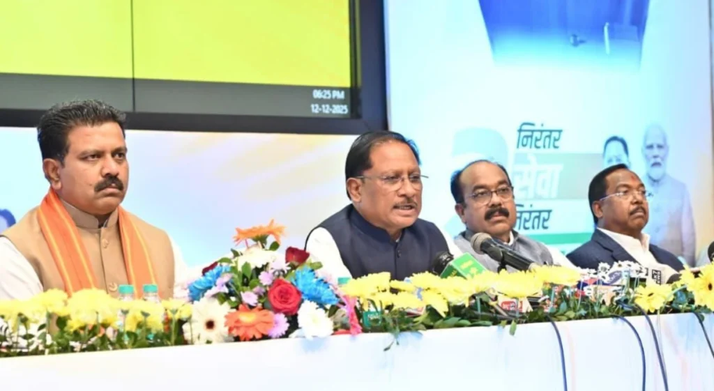 रायपुर 14 दिसंबर 2025- मुख्यमंत्री विष्णु देव साय ने आज वर्तमान सरकार के 2 वर्ष पूर्ण होने पर न्यू सर्किट हाउस सिविल लाइन्स में आयोजित प्रेसवार्ता में राज्य सरकार के दो वर्ष के कार्यकाल का रिपोर्ट कार्ड प्रस्तुत करते हुए कहा कि माननीय प्रधानमंत्री नरेन्द्र मोदी के नेतृत्व और उनकी गारंटियों पर विश्वास जताते हुए छत्तीसगढ़ की जनता ने जो सेवा का अवसर दिया, उसे सरकार ने पूरी निष्ठा और प्रतिबद्धता के साथ निभाया है। दो वर्षों में जनता का भरोसा और अधिक सशक्त हुआ है। मुख्यमंत्री साय ने कहा कि सरकार के गठन के दूसरे ही दिन 18 लाख से अधिक जरूरतमंद परिवारों को प्रधानमंत्री आवास की स्वीकृति दी गई। किसानों के लिए 3100 रुपये प्रति क्विंटल की दर से तथा 21 क्विंटल प्रति एकड़ के मान से धान खरीदी जारी है, जिससे खेती को लाभ का व्यवसाय बनाया गया है। उन्होंने कहा कि महिला सशक्तीकरण के लिए महतारी वंदन योजना एक ऐतिहासिक पहल बनी। लगभग 70 लाख माताओं-बहनों को प्रतिमाह 1000 रुपये की सहायता दी जा रही है। डीबीटी के माध्यम से अब तक 22 किस्तों में 14 हजार 306 करोड़ रुपये से अधिक की राशि जारी की जा चुकी है।
