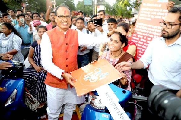 मुख्यमंत्री श्री शिवराज सिंह चौहान ने आज इंदौर प्रवास के दौरान दिव्यांग बहनों को रोजगार और उनका जीवन आसान बनाने की बड़ी सौगात दी। उन्होंने 10 दिव्यांग लाडली बहनों को एक विशेष तिपहिया TVS Jupiter स्कूटी भेंट की। जिन महिलाओं को यह स्कूटी मिली है, उनमें करुणा चिल्हाटे, पिंकी हिरवे, पिंकी दुबे, ममता साहू, दिव्या पामेचा, पुष्पा रसिले, योगिता सिसोदिया, पलक त्रिवेदी, सुरेखा चौहान और सुषमा मिश्रा शामिल हैं।