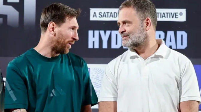 हैदराबाद में मेसी के खास पल: बच्चों के साथ फुटबॉल और राहुल गांधी से मुलाकात- विवादों के बीच मेसी ने हैदराबाद में फैंस को कुछ खास पल भी दिए। उन्होंने मुख्यमंत्री रेवंत रेड्डी से मुलाकात की और बच्चों के साथ फुटबॉल खेलते नजर आए, जो फैंस के लिए सुखद अनुभव था। मंच से मेसी ने कहा कि भारत से उन्हें हमेशा प्यार मिला है और यहां आकर खुशी हुई। इसी दौरान कांग्रेस नेता राहुल गांधी ने भी मेसी से मुलाकात की। दोनों के बीच हुई बातचीत सोशल मीडिया पर चर्चा का विषय बनी। मेसी ने राहुल गांधी को अपनी साइन की हुई जर्सी भी गिफ्ट की। यह पल राजनीति और खेल के अनोखे मेल को दर्शाता है, जो कम ही देखने को मिलता है।