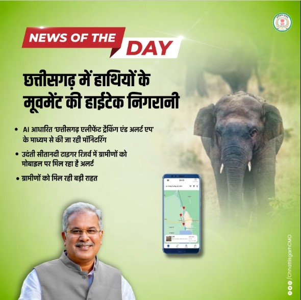 छत्तीसगढ़ के जंगलों में हाथियों की गतिविधियों की हाईटेक ट्रैकिंग शुरू की गई है। इस एआई के लिए “छत्तीसगढ़ हाथी ट्रैकिंग और अलर्ट ऐप” विकसित किया गया था। यह एप्लिकेशन पिछले 3 महीनों से उदंती सीतानदी टाइगर रिजर्व में उपयोग किया जा रहा है। 10 किलोमीटर के क्षेत्र में वास्तविक समय में हाथियों की आवाजाही के अलर्ट ग्रामीणों के मोबाइल फोन पर सफलतापूर्वक भेजे जाते हैं। इस एप्लिकेशन में ग्रामीणों के मोबाइल नंबर और जीपीएस लोकेशन दर्ज हैं। जब एलीफैंट ट्रैकर्स ऐप में हाथियों की गतिविधि को दर्ज करते हैं, तो ऐप अपने आप ग्रामीणों के मोबाइल फोन पर अलर्ट भेज देता है।