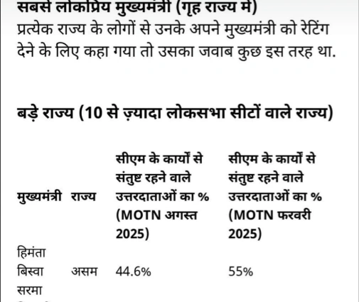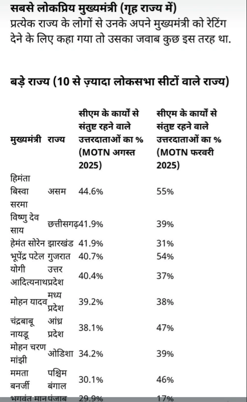 इंडिया टुडे–C Voter के Mood of the Nation (MOTN) सर्वे के अनुसार छत्तीसगढ़ के मुख्यमंत्री विष्णु देव साय के कामकाज से अपने गृह राज्य में 41.9% उत्तरदाता अगस्त 2025 में संतुष्ट बताए। यह आंकड़ा फरवरी 2025 के 39% से बढ़कर आया है — यानी हालिया सर्वे में उन के प्रति संतुष्टि में लगभग 2.9 प्रतिशत अंक की बढ़त दर्ज हुई। बड़े राज्यों के वर्ग में यह दूसरा स्थान बताता है; पहले स्थान पर असम के मुख्यमंत्री हिमंता बिस्वा सरमा हैं। बड़े राज्यों के संदर्भ में प्रदर्शन: बड़े राज्यों के समूह में साय का 41.9% अंक दूसरे स्थान की पुष्टि करता है — इससे पता चलता है कि गृह राज्य में उनकी स्वीकार्यता कई अन्य बड़े राज्यों के मुख्यमंत्रियों के बराबर-ऊपर है।