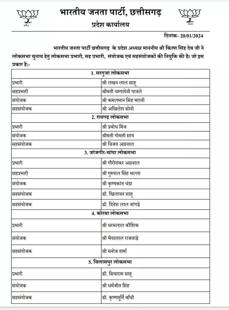 Lok Sabha Election 2024 विधानसभा चुनाव के बाद अब भारतीय जनता पार्टी लोकसभा चुनाव की तैयारी में जुट गई है। भाजपा ने राज्‍य की सभी 11 सीटों के लिए प्रभारी, सह प्रभारी, संयोजक और सह संयोजक की नियुक्ति कर दी छत्तीसगढ़ में मुख्यमंत्री विष्णुदेव साय के जरिए भाजपा ने बड़ा आदिवासी कार्ड खेला है। राजनीतिक प्रेक्षकों के अनुसार अगले लोकसभा चुनाव में आदिवासी समाज को साधने के लिए भाजपा का यह दांव कारगर साबित हो सकता है। पिछली बार बस्तर लोकसभा सीट से भाजपा को सीट गंवानी पड़ी थी, जबकि यह सीट वर्षों से भाजपा की थी। बस्तर आदिवासी बाहुल्य क्षेत्र है