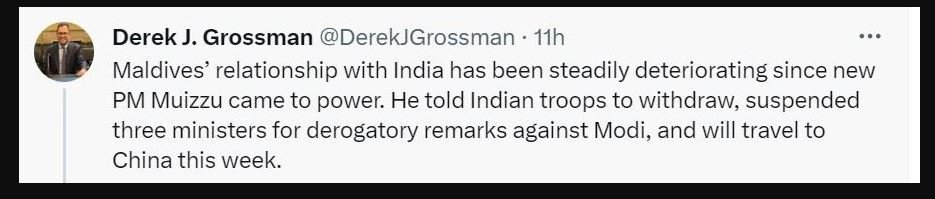 राष्ट्रीय सुरक्षा और इंडो-पैसिफिक विश्लेषकों ने कहा कि मोइसे के सत्ता में आने के बाद से मालदीव और भारत के बीच संबंध खराब हो गए हैं। उन्होंने कहा कि पद संभालने के बाद मोइज़ का भारत के खिलाफ पहला कदम भारतीय सेना को मालदीव से हटने के लिए कहना था। मालदीव के राष्ट्रपति ने तब परंपरा के मुताबिक भारत की बजाय चीन का दौरा किया। कई लोगों ने इस कार्रवाई को नई दिल्ली का अपमान माना.