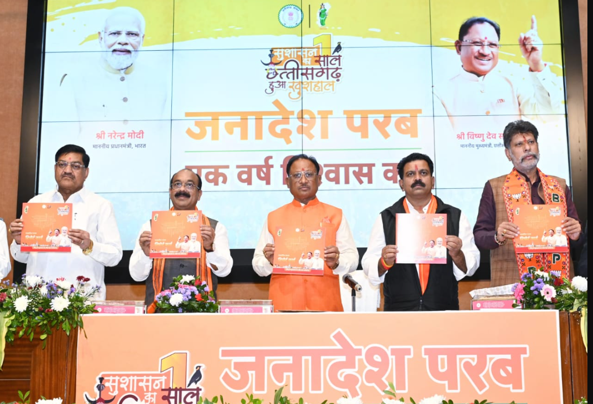 रायपुर 12 दिसंबर 2024 मुख्यमंत्री श्री विष्णुदेव साय ने अपने मंत्रिमण्डल के सदस्यों के साथ न्यू सर्किट हाउस सिविल लाईन में राज्य सरकार के एक वर्ष पूरे होने पर प्रेस कान्फ्रेंस को सम्बोधित किया। इस दौरान मुख्यमंत्री श्री साय ने महतारी वंदन योजना, प्रधानमंत्री आवास योजना, किसानों और तेंदूपत्ता संग्राहक हितग्राहियों को संबोधित पत्र ”विष्णु की पाती” , मुख्यमंत्री श्री साय के चुनिंदा भाषणों के चुनिंदा अंश पर आधारित ‘उद्गार : विजन और विचार’, प्रधानमंत्री आवास योजना के हितग्राहियों के अनुभव को दर्शाती पुस्तिका ‘खुशियों का आशियाना’, महतारी वंदन योजना के हितग्राहियों के अनुभवों को दर्शाती पुस्तिका ‘ खुशियों का नोटिफिकेशन’ , राज्य शासन के विजन को दर्शाती ‘सेवा ही सर्वोपरि’, छत्तीसगढ़ सरकार की विगत एक वर्ष की उपलब्धियों पर आधारित ‘सुशासन का एक साल, छत्तीसगढ़ हुआ खुशहाल’ का विमोचन किया। मुख्यमंत्री ने शासन की एक वर्ष की उपलब्धियों के रिपोर्ट कार्ड ‘जनादेश परब रिपोर्ट कार्ड’ का विमोचन किया। इस अवसर पर उपमुख्यमंत्री द्वय श्री अरूण साव एवं श्री विजय शर्मा सहित कृषि मंत्री श्री रामविचार नेताम, खाद्य मंत्री श्री दयालदास बघेल, वनमंत्री श्री केदार कश्यप, उद्योग मंत्री श्री लखनलाल देवांगन, वित्त मंत्री श्री ओपी चौधरी, स्वास्थ्य मंत्री श्री श्याम बिहारी जायसवाल, महिला एवं बाल विकास मंत्री श्रीमती लक्ष्मी राजवाड़े एवं खेल एवं युवा कल्याण मंत्री श्री टंकराम वर्मा, मुख्यमंत्री के सचिव श्री पी. दयानंद, जनसंपर्क आयुक्त जनसंपर्क श्री रवि मित्तल, संचालक श्री अजय कुमार अग्रवाल उपस्थित थे।