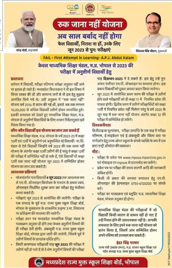 माध्यमिक शिक्षा मंडल, म.प्र. भोपाल में 2022-23 में कक्षा 10वीं और 12वीं में अनुत्तीर्ण एवं अनुपस्थित छात्रों को एम.एस. ऐसे मंडल छात्र जिन्होंने रुक जन नहीं योजना 2023 के तहत 10वीं कक्षा उत्तीर्ण की है, लेकिन 12वीं कक्षा की परीक्षा नहीं दे पाए हैं, वे छात्र भी जून 2025 में कक्षा 12वीं रुक जन नहीं योजना में शामिल होकर इस योजना का लाभ उठा सकते हैं।