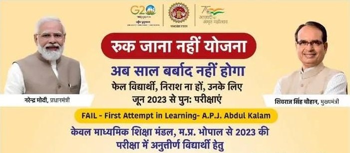 निराश मत हो – माध्यमिक शिक्षा मंडल की परीक्षाओं में किसी भी कारण से अनुत्तीर्ण होने वाले छात्रों को निराश होने की जरूरत नहीं है। आपकी सफलता के लिए हमने रुक जाना नहीं कार्यक्रम शुरू किया है जिसमें आप अपनी भागीदारी से अपना भविष्य उज्जवल कर सकते हैं : इंद्र सिंह परमार, राज्य मंत्री (स्वतंत्र प्रतिनिधि), स्कूली शिक्षा