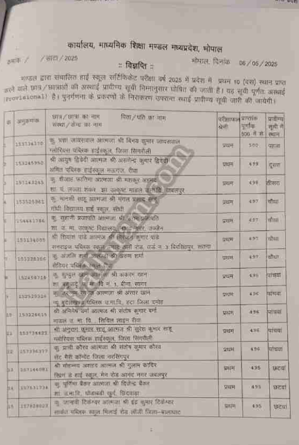 भोपाल: MP बोर्ड रिजल्ट 2025: मध्यप्रदेश के मुख्यमंत्री डॉ. मोहन यादव ने आज 10वीं और 12वीं के नतीजे घोषित कर दिए हैं। इस बार का रिजल्ट पिछले 15 सालों के रिकॉर्ड को भी पीछे छोड़ गया है! हमेशा की तरह, इस बार भी लड़कियों ने ही कमाल किया है। 10वीं में टॉपर प्रज्ञा जायसवाल बनी हैं, जिन्होंने पूरे 500 में से 500 नंबर हासिल किए हैं। प्रज्ञा सिंगरौली की रहने वाली हैं। वहीं, 12वीं में सतना की प्रियल सबसे आगे रहीं, उन्हें 500 में से 492 नंबर मिले हैं। सीएम ने कहा – अगर फेल हो गए तो हिम्मत मत हारना! मुख्यमंत्री डॉ. मोहन यादव ने रिजल्ट जारी करते हुए कहा कि अगर किसी बच्चे का रिजल्ट अच्छा नहीं आया या वो फेल हो गया है, तो उसे परेशान होने या निराश होने की ज़रूरत नहीं है। नई शिक्षा नीति के तहत, अब आपको जल्दी ही दोबारा परीक्षा देने का मौका मिलेगा। 17 जून से फिर से परीक्षा! इस बार नकल के मामले भी बहुत कम आए हैं। सिर्फ 40 मामले सामने आए और न ही कोई पेपर लीक हुआ, न ही कोई एफआईआर हुई। 17 जून से फिर से परीक्षा होगी, जिसमें फेल हुए बच्चे शामिल हो सकते हैं। अगर किसी को अपने नंबर सुधारने हैं, तो वो भी इस परीक्षा में बैठ सकता है। अब मध्यप्रदेश देश का तीसरा ऐसा राज्य बन गया है जो ऐसा कर रहा है।