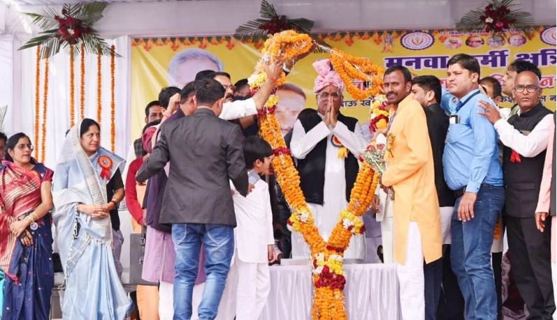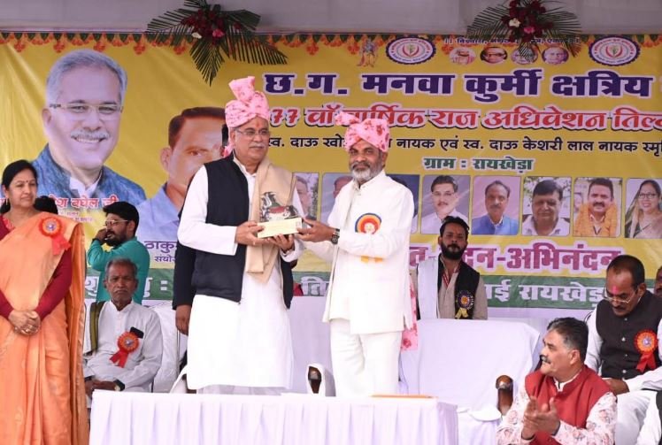 मुख्यमंत्री श्री भूपेश बघेल आज रायपुर जिले के तिल्दा विकासखण्ड के रायखेड़ा में आयोजित छत्तीसगढ़ मनवा कुर्मी क्षत्रिय समाज के 77वें राज अधिवेशन में शामिल हुए. इस अवसर पर बोलते हुए मुख्यमंत्री श्री बघेल ने कहा कि समाज के विकास के लिए सबकी भागीदारी जरूरी है. इससे समाज में एकता और संगठन का विकास होता है। सभी एक होंगे तो समाज में सामाजिक शांति का विकास होगा। साथ के बिना हम सब अधूरे हैं। मुख्यमंत्री श्री बघेल ने कहा कि संगठित समाज ही विकास की धारा में आगे बढ़ता है। मुख्यमंत्री ने इस अवसर पर रायखेड़ा गांव में बांधवा तालाब के सौंदर्यीकरण, रायखेड़ा गांव से देवगांव तक 4 किमी सड़क निर्माण और गांव में स्वामी आत्मानंद उत्कृष्ट अंग्रेजी माध्यम स्कूल खोलने के लिए 50 लाख रुपये देने की घोषणा की.