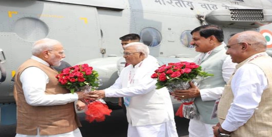 भोपाल : प्रधानमंत्री श्री नरेन्द्र मोदी का बुधवार को धार जिले की बदनावर तहसील स्थित ग्राम भैंसोला में देश के पहले पीएम मित्रा पार्क के शिलान्यास सहित विभिन्न राष्ट्रीय कार्यक्रमों के शुभारंभ के लिये आगमन हुआ। प्रधानमंत्री श्री मोदी का भैंसोला हैलीपेड पर राज्यपाल श्री मंगुभाई पटेल एवं मुख्यमंत्री डॉ. मोहन यादव ने पुष्पगुच्छ भेंट कर गर्मजोशी से आत्मीय स्वागत किया। इस अवसर पर राज्य शासन की ओर से मिनिस्टर इन वेटिंग नगरीय विकास एवं आवास मंत्री श्री कैलाश विजयवर्गीय, प्रदेश अध्यक्ष एवं विधायक श्री हेमंत खंडेलवाल, जनप्रतिनिधि सहित वरिष्ठ प्रशासनिक और पुलिस अधिकारियों ने स्वागत किया।