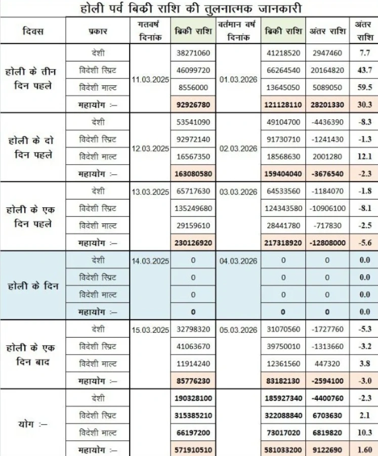 पिछले साल के मुकाबले मिला-जुला रुझान-आबकारी विभाग ने बताया कि 1 मार्च को पिछले साल की तुलना में शराब की बिक्री में लगभग 30.3 प्रतिशत की बढ़ोतरी हुई। हालांकि, इसके बाद के दो दिन और होली के अगले दिन बिक्री में थोड़ी गिरावट आई, लेकिन यह गिरावट ज्यादा बड़ी नहीं थी और लगभग 5.6 प्रतिशत तक सीमित रही। इससे पता चलता है कि बाजार में कुल मिलाकर सक्रियता बनी रही।