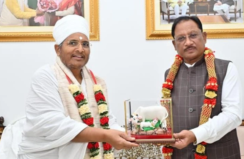 रायपुर 13 सितम्बर 2025- मुख्यमंत्री विष्णु देव साय से आज राजधानी रायपुर स्थित मुख्यमंत्री निवास में परम पूज्य संत असंग देव जी ने सौजन्य भेंट की। मुख्यमंत्री साय ने शॉल और श्रीफल भेंट कर पूज्य संत असंग देव जी का सम्मान किया तथा प्रदेश की सुख-समृद्धि का आशीर्वाद प्राप्त किया। संत असंग देव जी ने मुख्यमंत्री को गौमाता की प्रतिमा भेंट की। इस अवसर पर मुख्यमंत्री विष्णु देव साय और पूज्य संत असंग देव जी के मध्य विभिन्न आध्यात्मिक विषयों पर सार्थक चर्चा हुई। इस अवसर पर कैबिनेट मंत्री गुरु खुशवंत साहेब तथा बड़ी संख्या में संत असंग देव जी के अनुयायी संतगण भी उपस्थित थे।