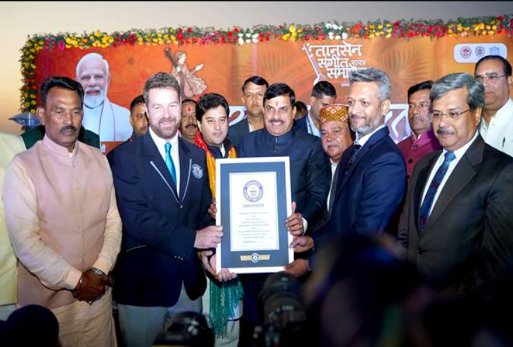 हमारे सभी देवी देवताओं की पहचान किसी न किसी वाद्य यंत्रों से जुड़ी है विश्व के पहले वाद्य यंत्र की प्रेरणा का स्रोत वर्षा की बूंद है ग्वालियर में बना हिन्दुस्तानी क्लासिकल संगीत का विश्व रिकार्ड गिनिज बुक ऑफ वर्ल्ड रिकार्ड में दर्ज हुई 546 कलाकारों द्वारा 9 वाद्य यंत्रों पर दी गई वृहद समवेत वाद्य यंत्र प्रस्तुति वायलेन, हारमोनियम, सारंगी, बांसुरी, सरोद, संतूर, शहनाई, पखावज, तबले पर शास्त्रीय बैंड द्वारा दी गई प्रस्तुति मुख्यमंत्री डॉ. यादव ने ग्वालियर में किया तानसेन संगीत समारोह 2024 का शुभारंभ