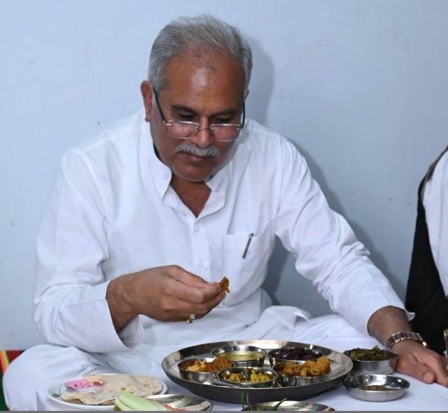 मुख्यमंत्री ने देवांगन परिवार के सदस्यों द्वारा सादगी से परोसे गए स्वादिष्ट छत्तीसगढ़ी भोजन का लुत्फ उठाया। देवांगन परिवार ने मुख्यमंत्री को चावल, दाल, कुसुम भाजी के साथ रोटी, लाल और अर्ध मिश्रित सब्जी, मूंग, बड़े आलू वाली सब्जी, भांटा, गोभी मटर, पापड़ जिम्मी कांडा, सलाद और विशेष चिरपोती पत्तल चटनी के साथ मुख्यमंत्री को परोसे। पूर्ण आत्मीयता। भी सेवा की। घर के मालिक झंगलू देवांगन और उनकी पत्नी श्रीमती। जब मुख्यमंत्री उनके घर भोजन करने आए तो बेसाखिन बाई को गर्व हुआ। मुख्यमंत्री ने श्री देवांगन एवं उनके परिवारजनों को उत्तम छत्तीसगढ़ी भोजन के लिए उपहार भेंट कर आभार व्यक्त किया.