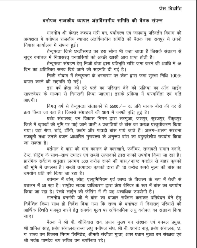रायपुर: माननीय श्री केदार कश्यप मंत्री वन, पर्यावरण एवं जलवायु परिवर्तन विभाग की अध्यक्षता में वनोपज राजकीय व्यापार अंतर्विभागीय समिति की बैठक नवा रायपुर में उनके निवास कार्यालय में संपन्न हुई। तेन्दूपत्ता जिसे छत्तीसगढ़ का हरा सोना भी कहा जाता है जिसके संग्रहण से सुदूर वनांचल में निवासरत् वनवासियों को अच्छी खासी आय प्राप्त होती है। तेन्दूपत्ता संग्रहण हेतु निजी क्रेता द्वारा प्रतिभूति राशि जमा करने की अवधि में 15 दिन का अतिरिक्त समय दिये जाने की सहमति दी गई है। निजी गोदाम में तेन्दूपत्ता के भण्डारण पर क्रेता द्वारा जमा सुरक्षा निधि 100% वापस करने की सहमति दी गई। इस वर्ष क्रेता को हरे पत्ते का परिदान देने की प्रक्रिया का ऑन लाईन साफ्टवेयर के माध्यम से निगरानी किया जाएगा। इसके प्रक्रिया में पारदर्शिता एवं गति आएगी। विगत् वर्ष से तेन्दूपत्ता संग्राहकों से 5500/- रू. प्रति मानक बोरा की दर से क्रय किया जा रहा है। जिससे संग्राहकों की आय में काफी वृद्धि हुई है।