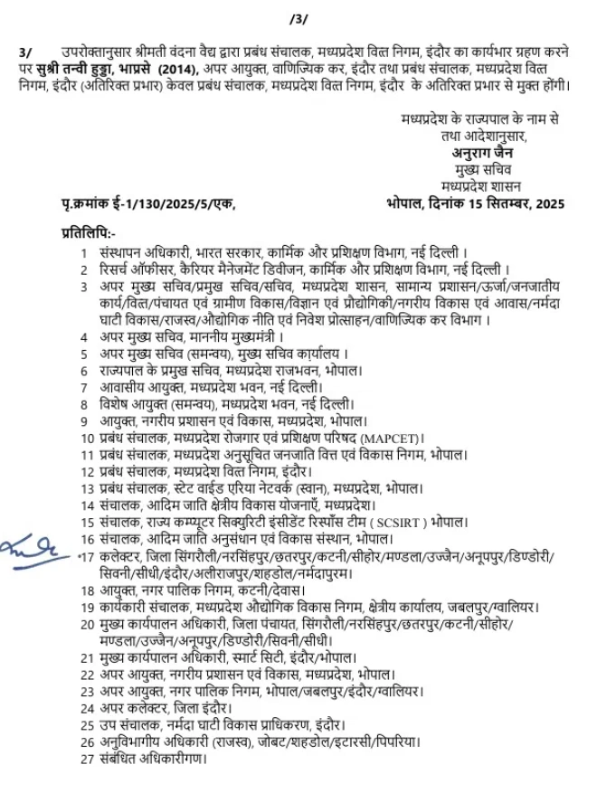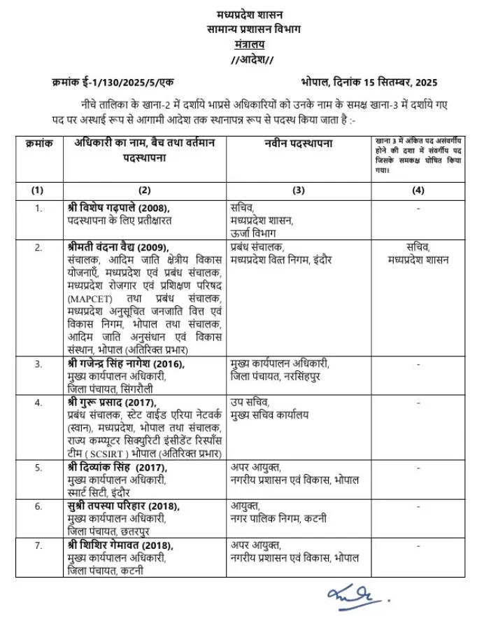 MP में बड़ा प्रशासनिक फेरबदल: 20 आईएएस अधिकारियों का हुआ तबादला! जानिए किसे मिली कौन सी जिम्मेदारी?-मध्य प्रदेश की सरकार ने प्रशासनिक व्यवस्था को और भी चुस्त-दुरुस्त बनाने के लिए एक बड़ा कदम उठाया है। इस बार कुल 20 आईएएस अधिकारियों को नई जिम्मेदारियां सौंपी गई हैं। सामान्य प्रशासन विभाग की ओर से जारी किए गए आदेशों के मुताबिक, इन तबादलों का मुख्य उद्देश्य सरकारी कामकाज में तेजी लाना और व्यवस्था को सुचारू बनाना है। आइए, जानते हैं कि किसे क्या महत्वपूर्ण पद मिला है और इस बदलाव से क्या उम्मीदें हैं।
