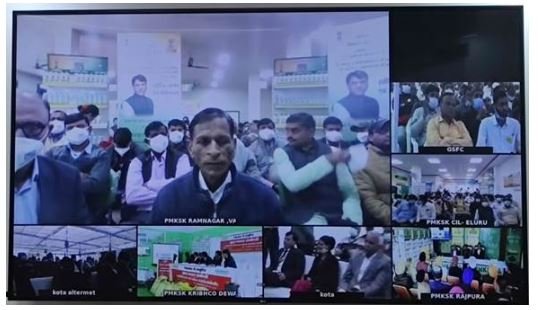 केंद्रीय रसायन और उर्वरक मंत्री डॉ. मनसुख मंडाविया देश भर में 9000 से अधिक प्रधानमंत्री किसान समृद्धि केंद्रों (पीएमकेएसके) के किसानों और खुदरा विक्रेताओं के साथ आभासी रूप से काम करते हैं