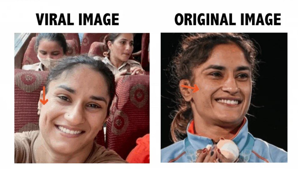 विनेश और संगीता की तस्वीरों को देखकर उनके दांत जब मुस्कुराते हैं तो ज्यादा नेचुरल लगते हैं। उनके गालों पर डिंपल भी नजर आ रहे हैं जो असल जिंदगी में देखने को नहीं मिलते हैं. हाल ही में जब पोप फ्रांसिस की तस्वीर भी वायरल हुई थी तो उसे एआई का इस्तेमाल कर बनाया गया था। एआई-जेनरेट की गई छवियों में पृष्ठभूमि भी धुंधली होती है। ऐसी छवियों में त्वचा और बनावट बहुत चिकनी दिखती है।