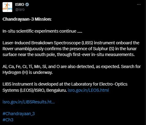 प्रज्ञान रोवर (चंद्रयान 3 निष्कर्ष) ऑक्सीजन (O), सल्फर (S), एल्युमिनियम (Al), कैल्शियम (Ca), आयरन (Fe), क्रोमियम (Cr), टाइटेनियम (Ti), सिलिकॉन (Si), मैंगनीज (Mn) ) ) चंद्रमा पर पाए गए हैं। यह सब रोवर के पेलोड लेजर इंड्यूस्ड ब्रेकडाउन स्पेक्ट्रोस्कोप (LIBS) का उपयोग करके खोजा गया था।