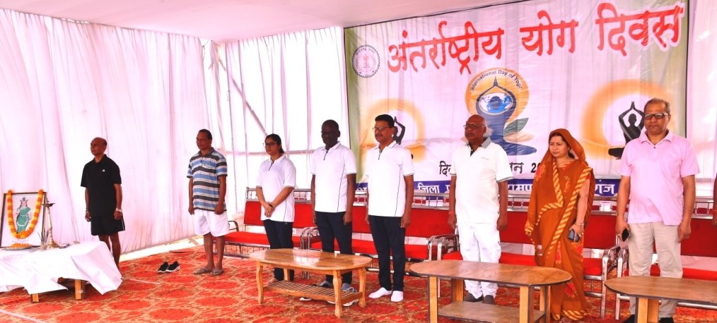 9वें अंतर्राष्ट्रीय योग दिवस के अवसर पर जिला मुख्यालय, बलरामपुर के स्वामी आत्मानंद हिन्दी उच्च विद्यालय के खेल मैदान में प्रातः 07:00 बजे से प्रातः 08:00 बजे तक जिला स्तरीय योगाभ्यास कार्यक्रम का आयोजन किया गया। कार्यक्रम के मुख्य अतिथि संसदीय सचिव एवं सामरी विधायक श्री चिंतामणि महाराज ने लोगों के साथ योगाभ्यास किया। गौरतलब है कि इस साल अंतरराष्ट्रीय योग दिवस ‘एक विश्व, एक स्वास्थ्य’ पर केंद्रित था और ‘हर घर आंगन योग’ के संदेश के साथ सामूहिक योग कार्यक्रम का आयोजन किया गया था. इस अवसर पर लोगों ने योग प्रशिक्षकों के मार्गदर्शन में ताड़ासन, वक्रासन, भुजंगासन और विभिन्न प्राणायामों का अभ्यास किया। योगाभ्यास कार्यक्रम में कलेक्टर श्री रेमिजियस एक्का, पुलिस अधीक्षक डाॅ. लाल उम्मेद सिंह एवं जिला पंचायत की मुख्य कार्यपालन अधिकारी श्रीमती रेना जमील शामिल हुए। इस दौरान विधायक श्री महाराज ने उपस्थित लोगों को दैनिक दिनचर्या में नियमित रूप से योग करने की शपथ दिलायी.